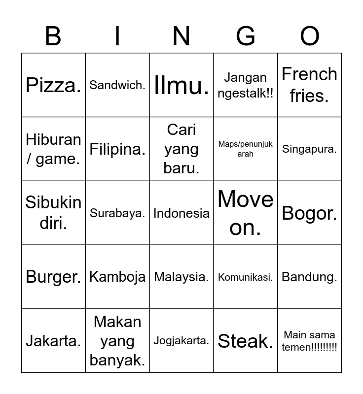 This bingo card has a free space and 24 words: Kamboja, Makan yang banyak., Cari yang baru., Jakarta., French fries., Pizza., Hiburan / game., Sandwich., Move on., Malaysia., Maps/penunjuk arah, Sibukin diri., Komunikasi., Bandung., Filipina., Steak., Bogor., Ilmu., Singapura., Surabaya., Main sama temen!!!!!!!!!, Burger., Jangan ngestalk!! and Jogjakarta..