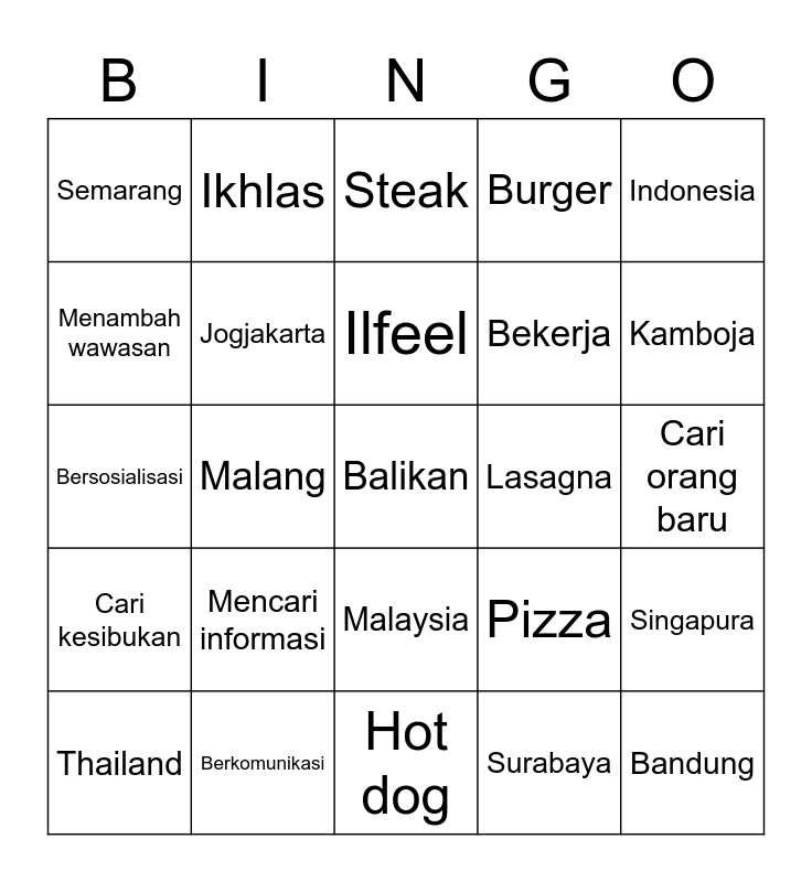 This bingo card has a free space and 24 words: Mencari informasi, Berkomunikasi, Ilfeel, Thailand, Indonesia, Semarang, Menambah wawasan, Ikhlas, Lasagna, Malaysia, Bekerja, Bersosialisasi, Pizza, Singapura, Jogjakarta, Surabaya, Cari orang baru, Steak, Kamboja, Malang, Bandung, Cari kesibukan, Burger and Hot dog.