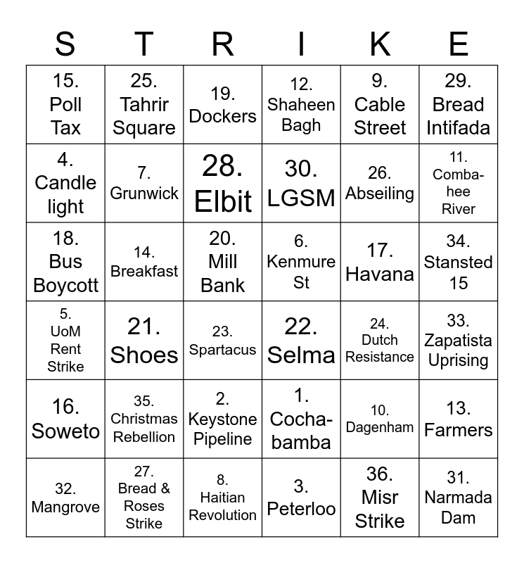 This bingo card has 36 words: 1. Cocha-bamba, 2. Keystone Pipeline, 3. Peterloo, 4. Candle light, 5. UoM Rent Strike, 6. Kenmure St, 7. Grunwick, 8. Haitian Revolution, 9. Cable Street, 10. Dagenham, 11. Comba- hee River, 12. Shaheen Bagh, 13. Farmers, 14. Breakfast, 30. LGSM, 15. Poll Tax, 16. Soweto, 17. Havana, 18. Bus Boycott, 19. Dockers, 20. Mill Bank, 21. Shoes, 22. Selma, 23. Spartacus, 24. Dutch Resistance, 25. Tahrir Square, 26. Abseiling, 27. Bread & Roses Strike, 28. Elbit, 29. Bread Intifada, 31. Narmada Dam, 32. Mangrove, 33. Zapatista Uprising, 34. Stansted 15, 35. Christmas Rebellion and 36. Misr Strike.