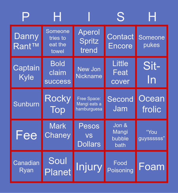 This bingo card has a free space and 24 words: Mark Chaney, Soul Planet, New Jon Nickname, Canadian Ryan, Someone pukes, Danny Rant™, Captain Kyle, Someone tries to eat the towel, Second Jam, Pesos vs Dollars, Little Feat cover, Sunburn, Jon & Mangi bubble bath, “You guyssssss”, Bold claim success, Food Poisoning, Ocean frolic, Aperol Spritz trend, Sit-In, Rocky Top, Foam, Fee, Contact Encore and Injury.