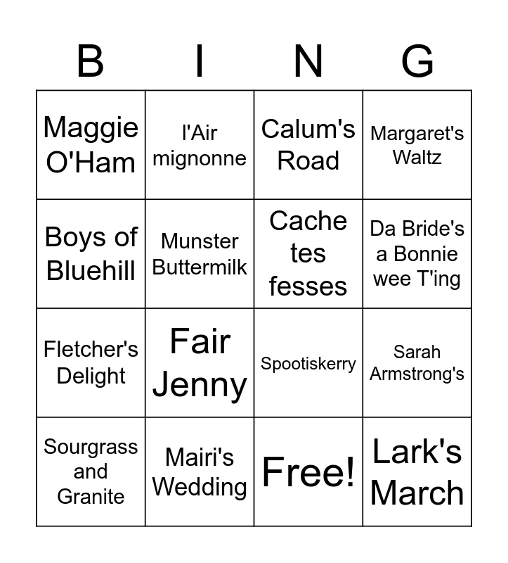 This bingo card has 26 words: Whiskey B/Bkfst, Jer the Rigger, Da Bride's a Bonnie wee T'ing, Rakes of Mallow, Boys of Bluehill, Maggie O'Ham, Munster Buttermilk, l'Air mignonne, Free!, Le caribou, Fletcher's Delight, Spootiskerry, Angeline, Waltz of the Little Girls, Sarah Armstrong's, Kerfunten, Margaret's Waltz, Lark's March, Calum's Road, Sourgrass and Granite, Fair Jenny, Swannanoa Waltz, Mairi's Wedding, Dancing Bear, Cache tes fesses and Vincent Campbell's.