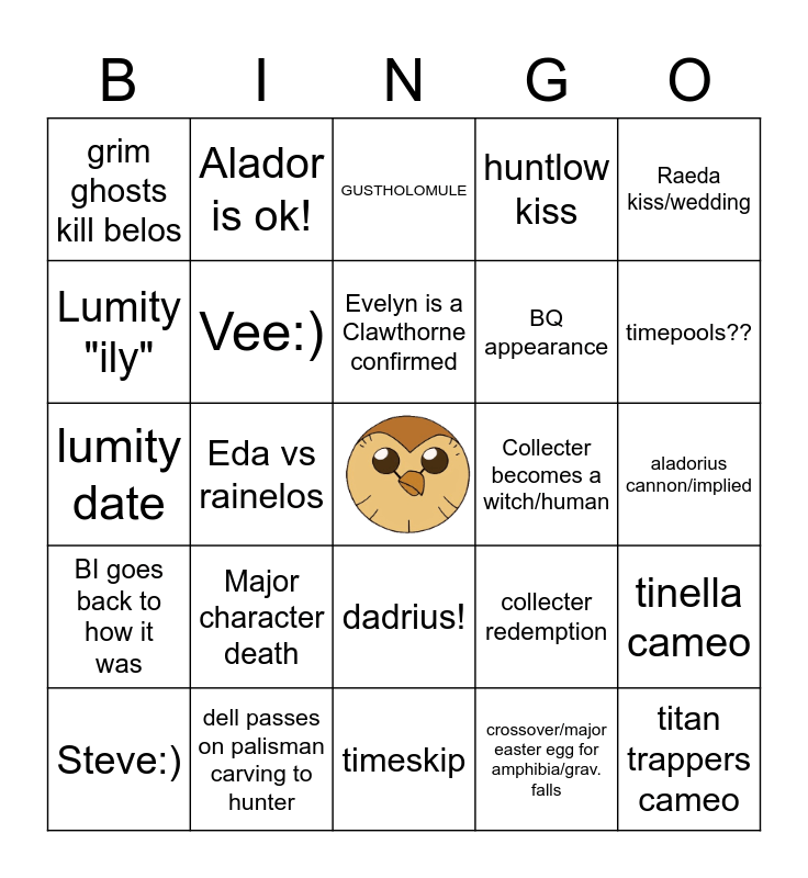 This bingo card has a free space and 24 words: Major character death, dell passes on palisman carving to hunter, Evelyn is a Clawthorne confirmed, Steve:), Raeda kiss/wedding, grim ghosts kill belos, Lumity "ily", Alador is ok!, Collecter becomes a witch/human, dadrius!, BQ appearance, lumity date, collecter redemption, tinella cameo, Vee:), crossover/major easter egg for amphibia/grav. falls, aladorius cannon/implied, GUSTHOLOMULE, timepools??, Eda vs rainelos, titan trappers cameo, BI goes back to how it was, huntlow kiss and timeskip.