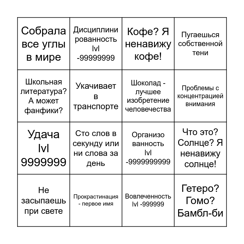 This bingo card has 16 words: Прокрастинация - первое имя, Что это? Солнце? Я ненавижу солнце!, Кофе? Я ненавижу кофе!, Собрала все углы в мире, Удача lvl 9999999, Дисциплини рованность lvl -99999999, Организо ванность lvl -9999999999, Вовлеченность lvl -999999, Школьная литература? А может фанфики?, Укачивает в транспорте, Не засыпаешь при свете, Пугаешься собственной тени, Сто слов в секунду или ни слова за день, Проблемы с концентрацией внимания, Шоколад - лучшее изобретение человечества and Гетеро? Гомо? Бамбл-би.