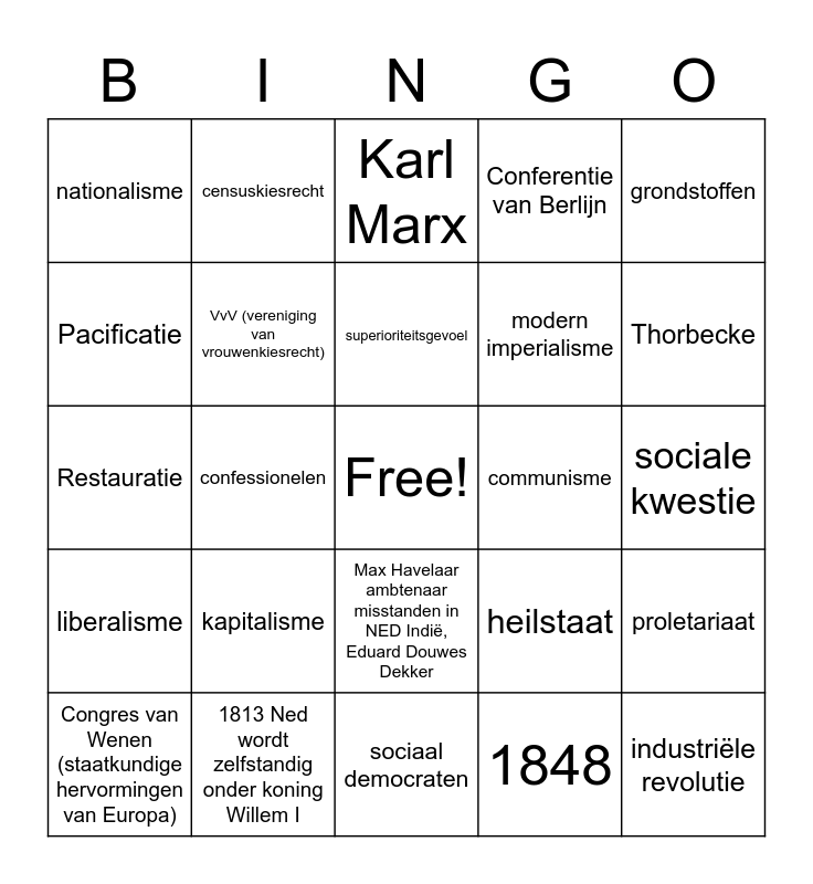 This bingo card has a free space and 28 words: proletariaat, schoolstrijd, modern imperialisme, 1848, Pacificatie, Karl Marx, censuskiesrecht, liberalisme, communisme, Congres van Wenen (staatkundige hervormingen van Europa), Restauratie, Conferentie van Berlijn, 1813 Ned wordt zelfstandig onder koning Willem I, sociaal democraten, Thorbecke, Mevrouw Romijn, kapitalisme, VvV (vereniging van vrouwenkiesrecht), superioriteitsgevoel, Max Havelaar ambtenaar misstanden in NED Indië, Eduard Douwes Dekker, nationalisme, huisnijverheid, industriële revolutie, confessionelen, sociale kwestie, heilstaat, grondstoffen and afzetmarkten.