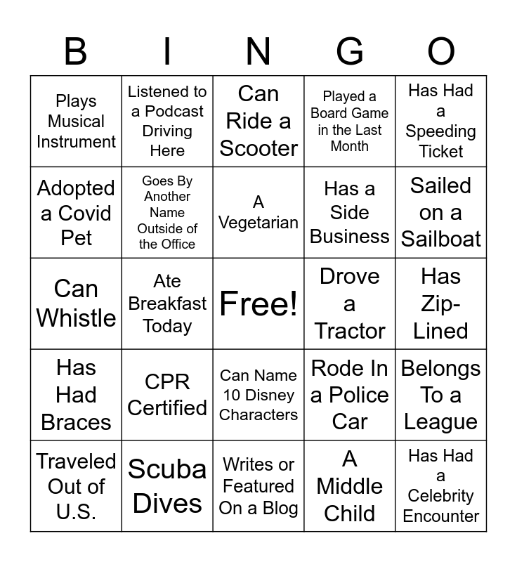 This bingo card has a free space and 55 words: Born In Same Month, Traveled Out of U.S., Same Favorite School Subject, Plays Musical Instrument, Writes or Featured On a Blog, Speaks More Than 2 Languages, Goes By Another Name Outside of the Office, Climbed a Mountain, Has a Side Business, Has Never Seen the Ocean, Played a Board Game in the Last Month, Never Had a Cavity, Ran In a Marathon, Eats Mac & Cheese With a Spoon, Has Been on TV, Has Been In a Play, Has Had a Speeding Ticket, Ate Breakfast Today, Can Say the Alphabet Backwards, Has Had a Celebrity Encounter, Drove a Tractor, Does Not Eat Pizza, Rode In a Police Car, Can Ride a Scooter, Did Not Make Their Bed Today, A Vegetarian, A Middle Child, Served in Military / ROTC, Has Zip-Lined, Belongs To a League, Has Broken a Bone, Quit a Bad Habit, Took a How-To Class Recently, Volunteers, Adopted a Covid Pet, Can Whistle, Participated in 4H, Has Had Braces, Can Drive a Manual Car, Has a Fishing License, Listened to a Podcast Driving Here, Rock Climnbs, Favorite Season is Summer, Been Stung By a Jelly Fish, CPR Certified, Scuba Dives, Never Ate Pineapple, Has Made a Sand Castle, Swam With Dolphins, Sailed on a Sailboat, Owns a Bowling Ball, Still Has a Christmas Tree Up, Can Recite Pi Past 3.14, Can Name 10 Disney Characters and Color Blind.