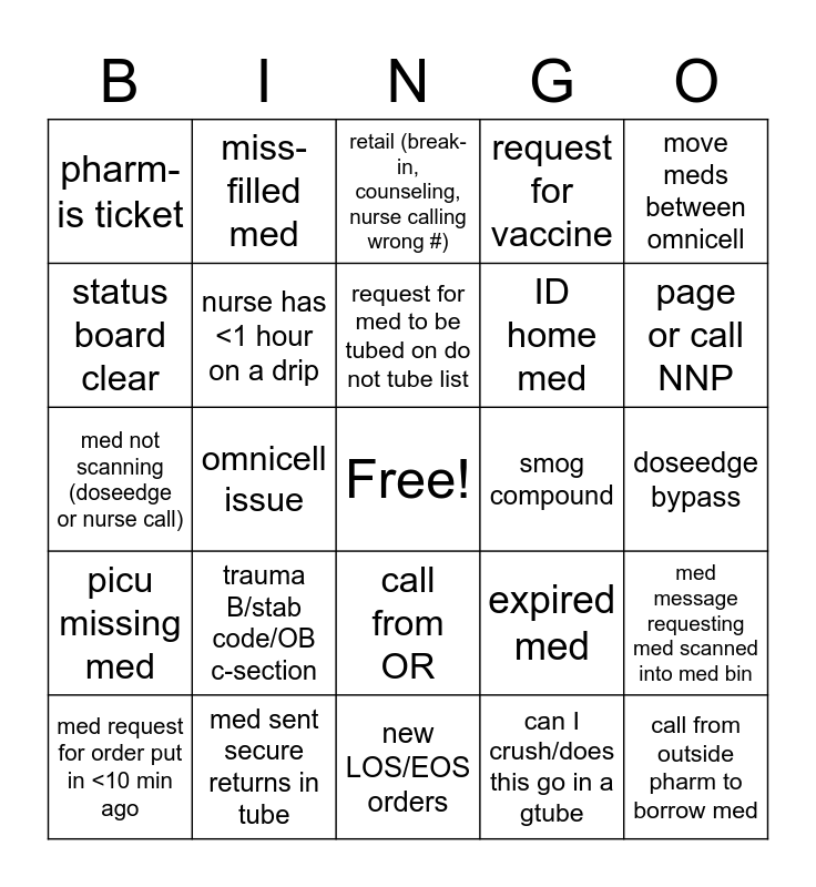 This bingo card has a free space and 34 words: compatibility question, can I crush/does this go in a gtube, stat alteplase, code response needed, picu missing med, nurse has <1 hour on a drip, move meds between omnicell, med request for order put in <10 min ago, miss-filled med, page on call, request for med to be tubed on do not tube list, retail (break-in, counseling, nurse calling wrong #), call to borrow a med, med message requesting drug in omnicell, smog compound, page or call NNP, med sent secure returns in tube, med not scanning (doseedge or nurse call), trauma B/stab code/OB c-section, expired med, call from OR, new DKA needs bags STAT, pharm-is ticket, doseedge bypass, new LOS/EOS orders, call from outside pharm to borrow med, request for vaccine, recon med, ID home med, status board clear, request for on call electrolytes, omnicell issue, med message requesting med scanned into med bin and phone call from MD needing dose recommendation.