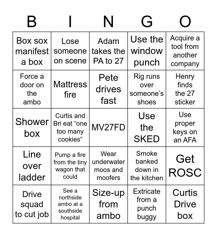 This bingo card has a free space and 24 words: Pump a fire from the tiny wagon that could, See a northside ambo at a southside hospital, Pete drives fast, Drive squad to cut job, Acquire a tool from another company, Box sox manifest a box, Force a door on the ambo, Lose someone on scene, Use the SKED, Wear underwater moos and moofers, Rig runs over someone’s shoes, Shower box, Smoke banked down in the kitchen, Get ROSC, Mattress fire, Extricate from a punch buggy, Use proper keys on an AFA, Adam takes the PA to 27, Henry finds the 27 sticker, Curtis and Bri eat “one too many cookies”, Curtis Drive box, Line over ladder, Use the window punch and Size-up from ambo.