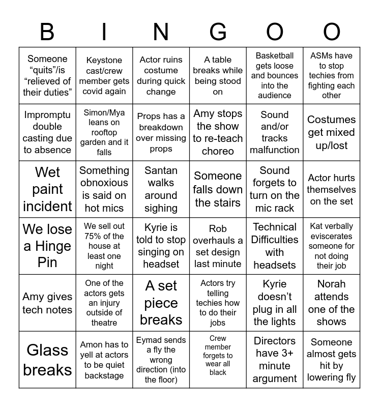 This bingo card has 36 words: Actors try telling techies how to do their jobs, A set piece breaks, Crew member forgets to wear all black, Impromptu double casting due to absence, We lose a Hinge Pin, Someone falls down the stairs, Simon/Mya leans on rooftop garden and it falls, Eymad sends a fly the wrong direction (into the floor), Basketball gets loose and bounces into the audience, Kyrie doesn’t plug in all the lights, Costumes get mixed up/lost, A table breaks while being stood on, Norah attends one of the shows, Something obnoxious is said on hot mics, Amy stops the show to re-teach choreo, Someone “quits”/is “relieved of their duties”, Amy gives tech notes, Sound forgets to turn on the mic rack, Wet paint incident, Actor ruins costume during quick change, Santan walks around sighing, We sell out 75% of the house at least one night, Rob overhauls a set design last minute, Kyrie is told to stop singing on headset, Technical Difficulties with headsets, Keystone cast/crew member gets covid again, Sound and/or tracks malfunction, Amon has to yell at actors to be quiet backstage, Props has a breakdown over missing props, ASMs have to stop techies from fighting each other, Someone almost gets hit by lowering fly, Glass breaks, Kat verbally eviscerates someone for not doing their job, Actor hurts themselves on the set, One of the actors gets an injury outside of theatre and Directors have 3+ minute argument.