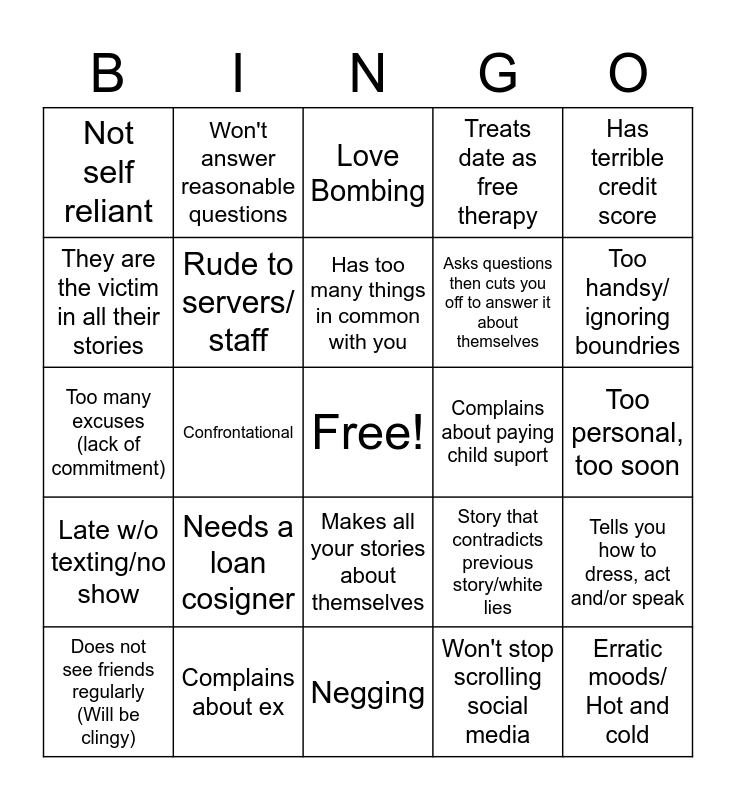 This bingo card has a free space and 24 words: Needs a loan cosigner, Complains about ex, Has too many things in common with you, Does not see friends regularly (Will be clingy), Has terrible credit score, Not self reliant, They are the victim in all their stories, Won't answer reasonable questions, Complains about paying child suport, Makes all your stories about themselves, Asks questions then cuts you off to answer it about themselves, Too many excuses (lack of commitment), Story that contradicts previous story/white lies, Tells you how to dress, act and/or speak, Rude to servers/ staff, Won't stop scrolling social media, Too personal, too soon, Love Bombing, Too handsy/ ignoring boundries, Confrontational, Erratic moods/ Hot and cold, Late w/o texting/no show, Treats date as free therapy and Negging.