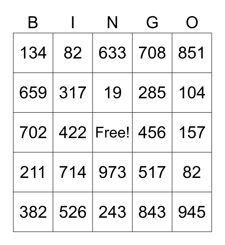 This bingo card has a free space and 24 words: 714, 526, 19, 382, 851, 134, 659, 82, 456, 973, 285, 702, 517, 82, 317, 843, 157, 633, 104, 422, 945, 211, 708 and 243.