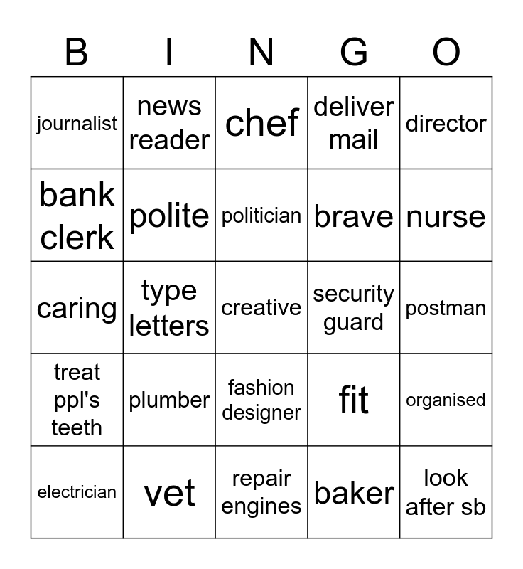 This bingo card has a free space and 24 words: plumber, vet, politician, electrician, director, journalist, bank clerk, news reader, security guard, fashion designer, brave, caring, fit, organised, polite, baker, postman, chef, nurse, type letters, look after sb, treat ppl's teeth, deliver mail and repair engines.