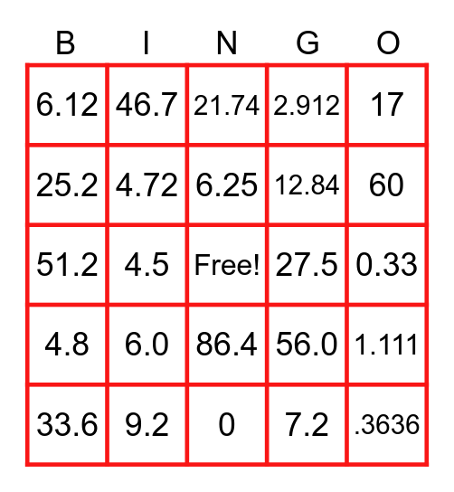 This bingo card has a free space and 24 words: 6.0, 9.2, 6.25, 33.6, 17, 6.12, 25.2, 46.7, 27.5, 86.4, 12.84, 51.2, 56.0, 1.111, 4.72, 7.2, 0.33, 21.74, 60, 4.5, .3636, 4.8, 2.912 and 0.