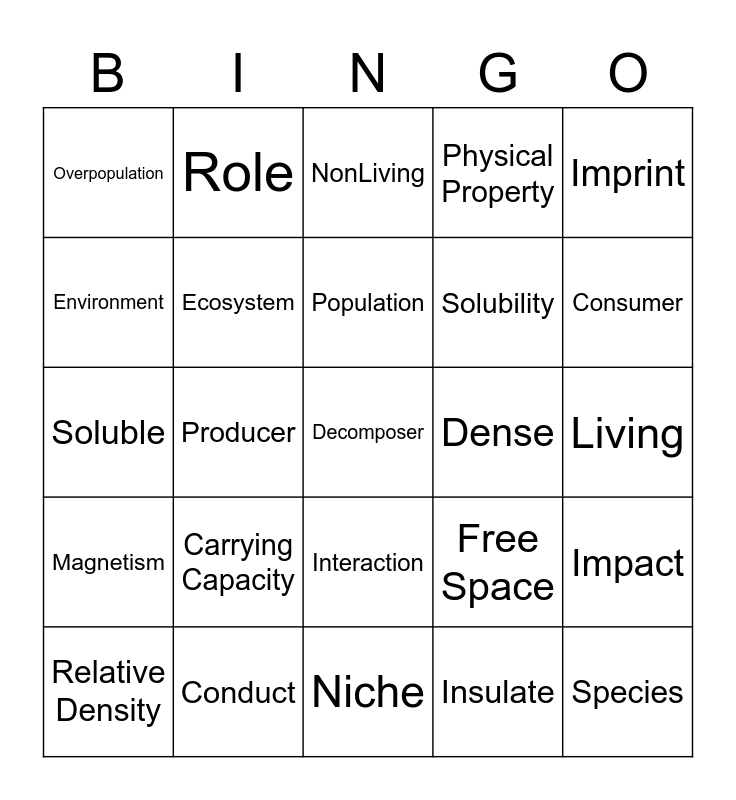 This bingo card has 25 words: Carrying Capacity, Niche, Population, Relative Density, Imprint, Overpopulation, Environment, Role, Dense, Interaction, Solubility, Soluble, Free Space, Impact, Ecosystem, Species, Living, NonLiving, Consumer, Producer, Decomposer, Conduct, Magnetism, Physical Property and Insulate.