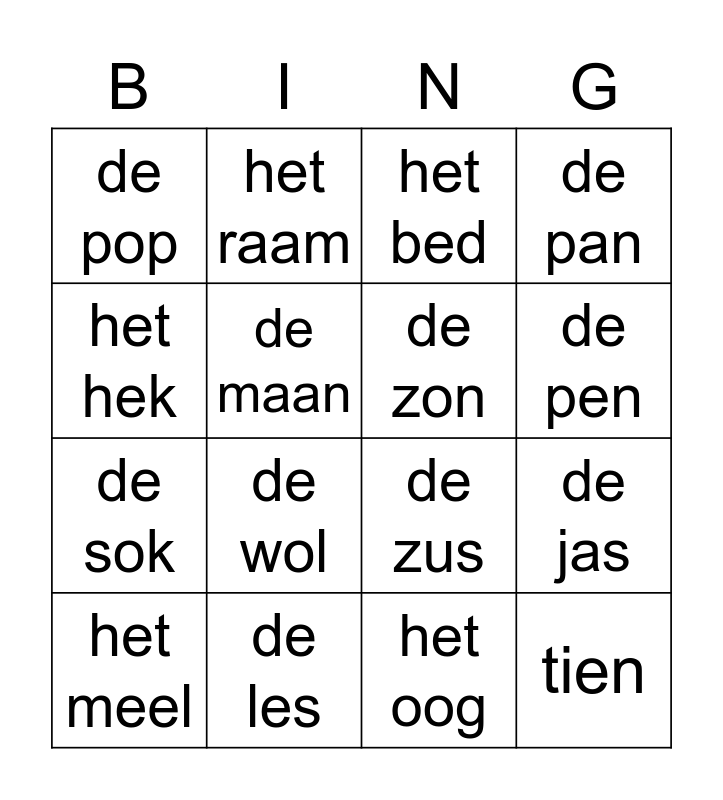 This bingo card has 47 words: de das, het meel, het dak, de vis, de kaas, de vaas, het raam, de roos, de maan, de teen, de zon, de pan, het sap, de pil, de kip, de pet, de pen, de les, het mes, het hek, de jas, de kok, de pop, de sok, het hok, de wol, de mok, de riem, het riet, tien, vier, de mier, de kier, de kies, ik nies, vies, het oog, de rug, het been, de bus, de boom, het bed, de zus, de hak, de bril, de gum and de vlag.
