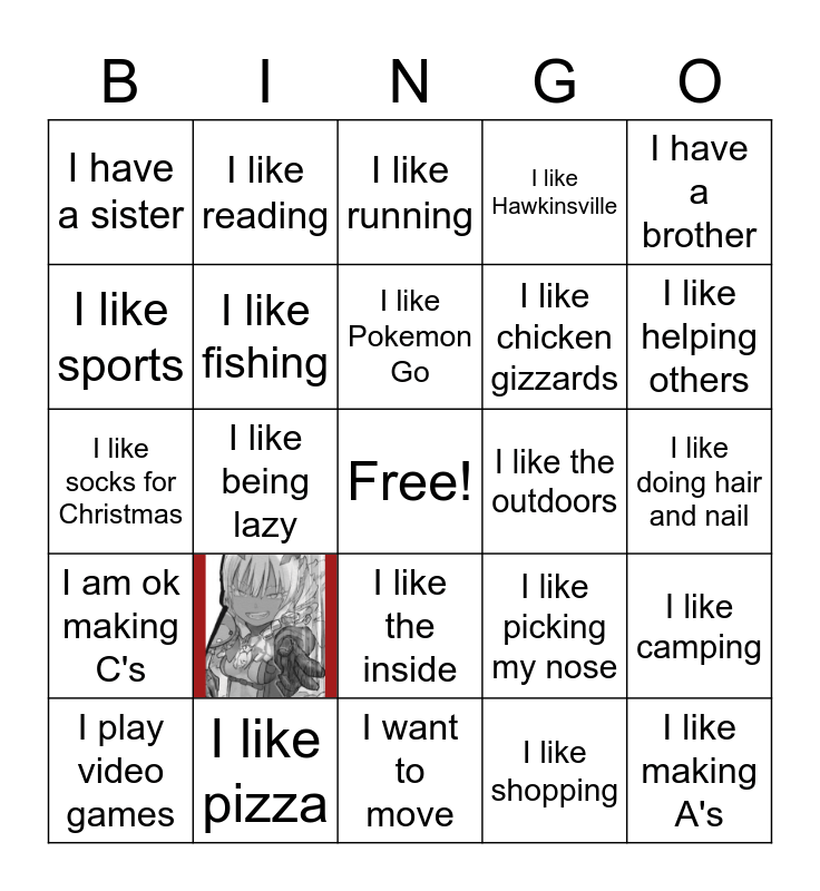This bingo card has 1 images, a free space and 23 words: I like pizza, I like Pokemon Go, I play video games, I have a brother, I have a sister, I like sports, I like reading, I like the outdoors, I like the inside, I like chicken gizzards, I like socks for Christmas, I like picking my nose, I like camping, I like fishing, I like shopping, I like doing hair and nail, I like running, I like helping others, I like being lazy, I like making A's, I am ok making C's, I like Hawkinsville and I want to move.