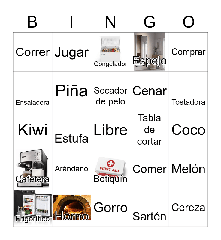 This bingo card has 28 images, a free space and 116 words: Sillón, Estantería, Silla, Mesa, Sofá, Chimenea, Espejo, Bañera, Lavabo, Inodoro, Alfombra, Grifo, Ducha, Bidé, Armario, Aparador, Botiquín, Mesilla de noche, Cama, Báscula, Frigorífico, Congelador, Nevera, Microondas, Lavavajillas, Cafetera, Horno, Batidora, Lavadora, Secadora, Tostadora, Secador de pelo, Estufa, Aspiradora, Plancha, Freidora, Corta césped, Timbre, Lámpara, Cuchara, Cuchillo, Tenedor, Cucharilla, Pinzas, Tenazas, Olla, Sartén, Ensaladera, Pelador, Espátula, Cacerola, Tabla de cortar, Rallador, Bol, Colador, Salero, Cazo, Pera, Manzana, Fresa, Melón, Sandía, Plátano, Limón, Mango, Naranja, Uva, Piña, Kiwi, Frambuesa, Coco, Aguacate, Pomelo, Mora, Melocotón, Cereza, Arándano, Correr, Andar, Gritar, Reír, Jugar, Dormir, Comer, Cenar, Desayunar, Viajar, Volar, Escribir, Estudiar, Hablar, Cortar, Casarse, Pelear, Comprar, Trabajar, Beber, Camisa, Anillo, Pantalón, Zapatos, Abrigo, Vaqueros, Bragas, Collar, Calzoncillos, Calcetines, Chaqueta, Gorro, Sujetador, Guantes, Gafas, Camiseta, Reloj, Pulsera and Bufanda.