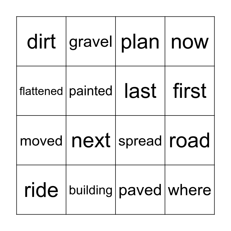 This bingo card has 16 words: building, road, plan, dirt, moved, gravel, spread, paved, flattened, painted, ride, now, next, first, last and where.