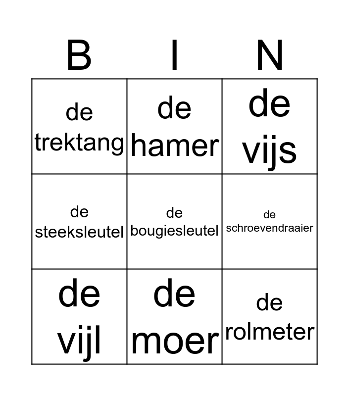 This bingo card has 9 words: de vijl, de vijs, de hamer, de steeksleutel, de trektang, de schroevendraaier, de bougiesleutel, de rolmeter and de moer.