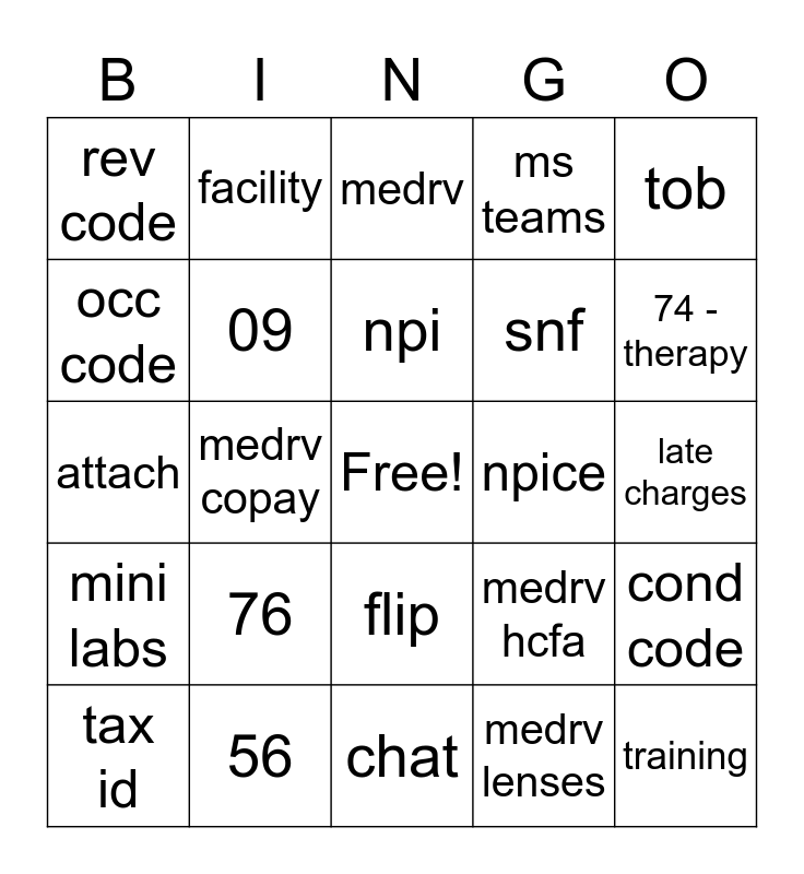 This bingo card has a free space and 24 words: 76, 56, npi, tax id, tob, rev code, occ code, facility, npice, flip, snf, attach, medrv hcfa, cond code, 09, medrv lenses, late charges, medrv, 74 - therapy, medrv copay, training, mini labs, ms teams and chat.