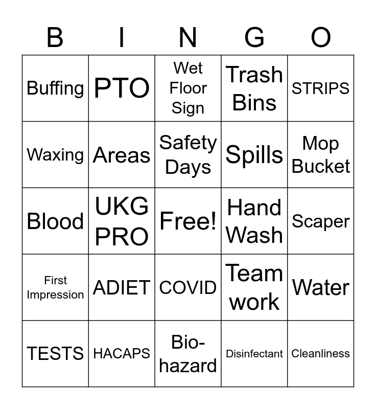 This bingo card has a free space and 24 words: ADIET, HACAPS, Safety Days, TESTS, STRIPS, Buffing, Waxing, PTO, Hand Wash, COVID, Spills, Blood, Team work, Water, Areas, Disinfectant, Scaper, Wet Floor Sign, Mop Bucket, UKG PRO, Cleanliness, First Impression, Trash Bins and Bio-hazard.