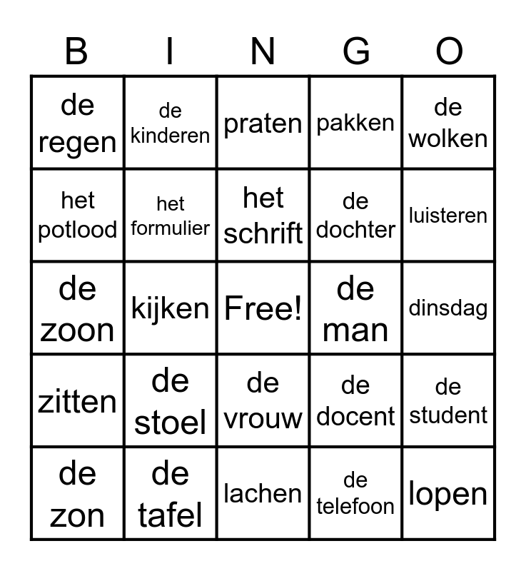 This bingo card has a free space and 24 words: de stoel, de tafel, het schrift, de zon, de wolken, de regen, het potlood, de kinderen, de man, de vrouw, de dochter, de zoon, de docent, de student, het formulier, de telefoon, dinsdag, praten, luisteren, kijken, lopen, zitten, pakken and lachen.