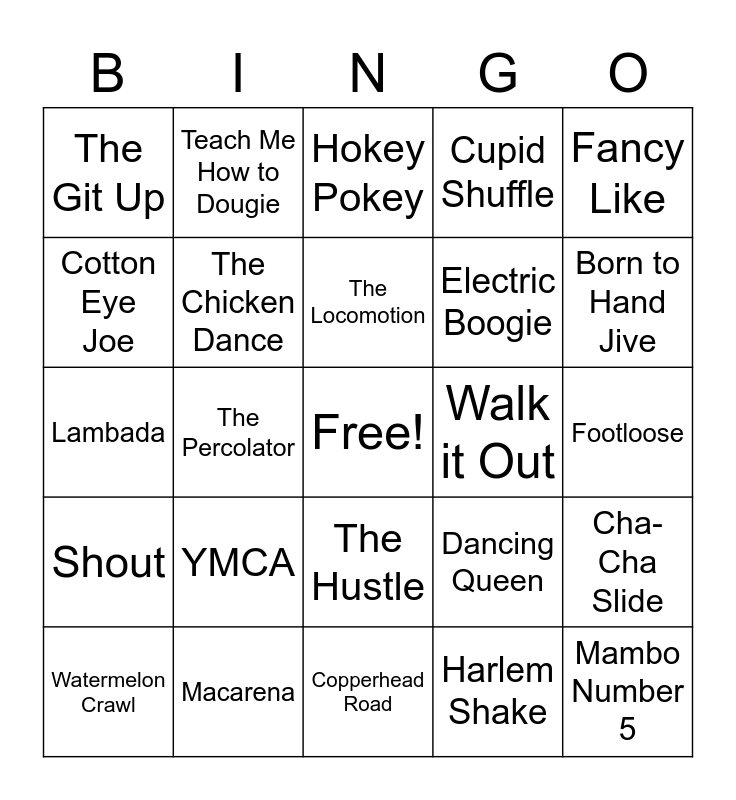 This bingo card has a free space and 24 words: YMCA, Macarena, The Locomotion, Watermelon Crawl, Fancy Like, The Git Up, Cotton Eye Joe, Teach Me How to Dougie, Walk it Out, The Hustle, Electric Boogie, Lambada, Dancing Queen, Cha-Cha Slide, The Chicken Dance, Harlem Shake, Footloose, Hokey Pokey, Born to Hand Jive, The Percolator, Mambo Number 5, Shout, Cupid Shuffle and Copperhead Road.