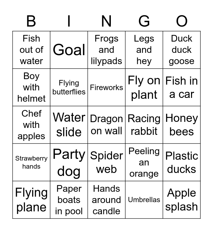 This bingo card has a free space and 48 words: Starfish, Apple splash, Hummingbird, Hands around candle, Party dog, Easter eggs, Goal, Girl in poppy field, Boy with helmet, Butterfly and flower, Flying butterflies, Legs and hey, Plastic ducks, Peeling an orange, Baseball boy, Ladybug on a flower, Fireworks, Racing rabbit, Guinea pig hiding, Duck duck goose, Water slide, Umbrellas, Fish out of water, Fly on plant, Christmas baubles, Fish in a car, Flying plane, Butterfly escape, Spider web, Strawberry hands, Kick the ball, Lifesaving ring, Pantied hands, Floating beach Ball, Paper boats in pool, Bule jellyfish, Blowing bubbles, Honey bees, Shell on beach, Gumballs in the sky, Swinging chairs, Apple basket, Frogs and lilypads, Popcorn and ticket, Chef with apples, Hands in, Blowing dandelion and Baseball field.