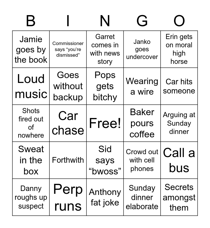 This bingo card has a free space and 24 words: Forthwith, Perp runs, Pops gets bitchy, Danny roughs up suspect, Erin gets on moral high horse, Jamie goes by the book, Loud music, Commissioner says “you’re dismissed”, Baker pours coffee, Sid says “bwoss”, Wearing a wire, Shots fired out of nowhere, Crowd out with cell phones, Call a bus, Goes without backup, Sunday dinner elaborate, Arguing at Sunday dinner, Garret comes in with news story, Car hits someone, Car chase, Secrets amongst them, Sweat in the box, Janko goes undercover and Anthony fat joke.