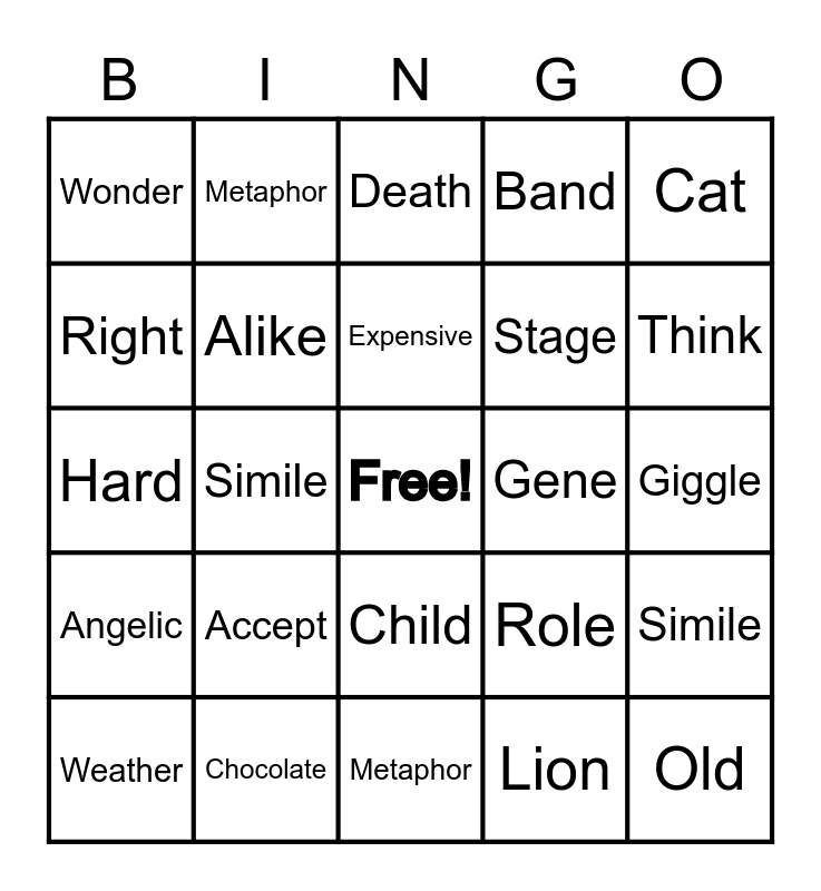 This bingo card has a free space and 24 words: Accept, Chocolate, Expensive, Weather, Cat, Wonder, Right, Metaphor, Gene, Child, Stage, Hard, Role, Simile, Alike, Lion, Giggle, Death, Think, Simile, Old, Angelic, Band and Metaphor.