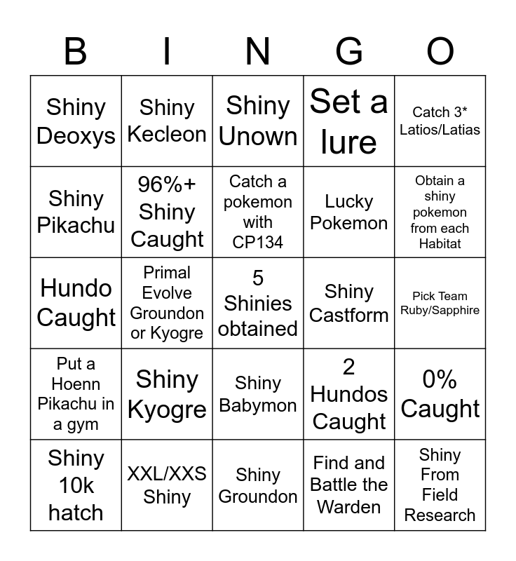 This bingo card has 25 words: Shiny Kyogre, Shiny Groundon, Catch a pokemon with CP134, Shiny 10k hatch, Catch 3* Latios/Latias, Shiny Deoxys, Shiny Pikachu, Shiny Kecleon, Shiny Castform, Shiny Babymon, Lucky Pokemon, Hundo Caught, 2 Hundos Caught, 0% Caught, 96%+ Shiny Caught, Shiny From Field Research, Pick Team Ruby/Sapphire, Shiny Unown, Obtain a shiny pokemon from each Habitat, Primal Evolve Groundon or Kyogre, 5 Shinies obtained, XXL/XXS Shiny, Put a Hoenn Pikachu in a gym, Set a lure and Find and Battle the Warden.