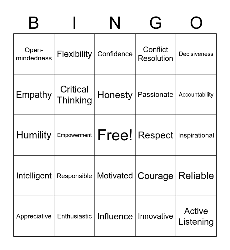 This bingo card has a free space and 24 words: Responsible, Enthusiastic, Honesty, Appreciative, Decisiveness, Open-mindedness, Empathy, Flexibility, Respect, Motivated, Passionate, Humility, Courage, Reliable, Critical Thinking, Innovative, Inspirational, Confidence, Accountability, Empowerment, Active Listening, Intelligent, Conflict Resolution and Influence.