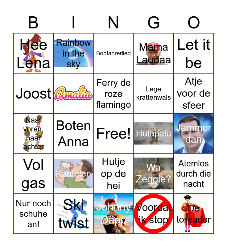 This bingo card has 21 images, a free space and 43 words: Hullemaal kapot, Kantelen, Wienerschnitzel, Voordat ik stop, Allemaal voor Nederland, Ik ga zwemmen, Paddenstoel Paddenstoel, Mama Laudaa, De toreador, Hee Lena, Ski twist, Wa Zeggie?, Jammer dan, Reünie, Country roads, Johnny Däpp, Hulapalu, Handen Hoog, Naar voren, naar achter, Rainbow in the sky, Hutje op de hei, Jodel jump, Let it be, Ruitenwisser, Radler ist kein alcohol, Ferry de roze flamingo, Joana, Atemlos durch die nacht, Nur noch schuhe an!, Hey baby, Bobfahrerlied, Pocahontas, Sweet Caroline, Vol gas, Boven op de berg, Dup Dup, Springen, Atje voor de sfeer, Joost, Boten Anna, Huisje op wielen, Lege krattenwals and Liever te dik in de kist.