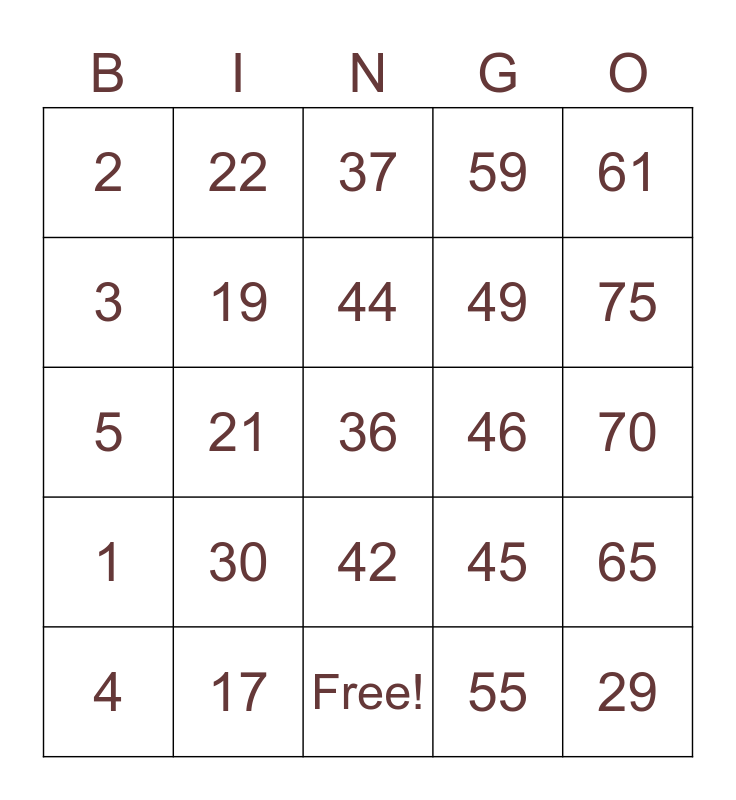 This bingo card has 25 words: 1, 17, 36, 55, 61, 2, 22, 37, 46, 65, 3, 19, Free!, 45, 75, 4, 21, 44, 49, 70, 5, 30, 42, 59 and 29.