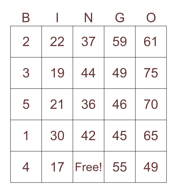 This bingo card has 25 words: 1, 17, 36, 55, 61, 2, 22, 37, 46, 65, 3, 19, Free!, 45, 75, 4, 21, 44, 49, 70, 5, 30, 42, 59 and 49.