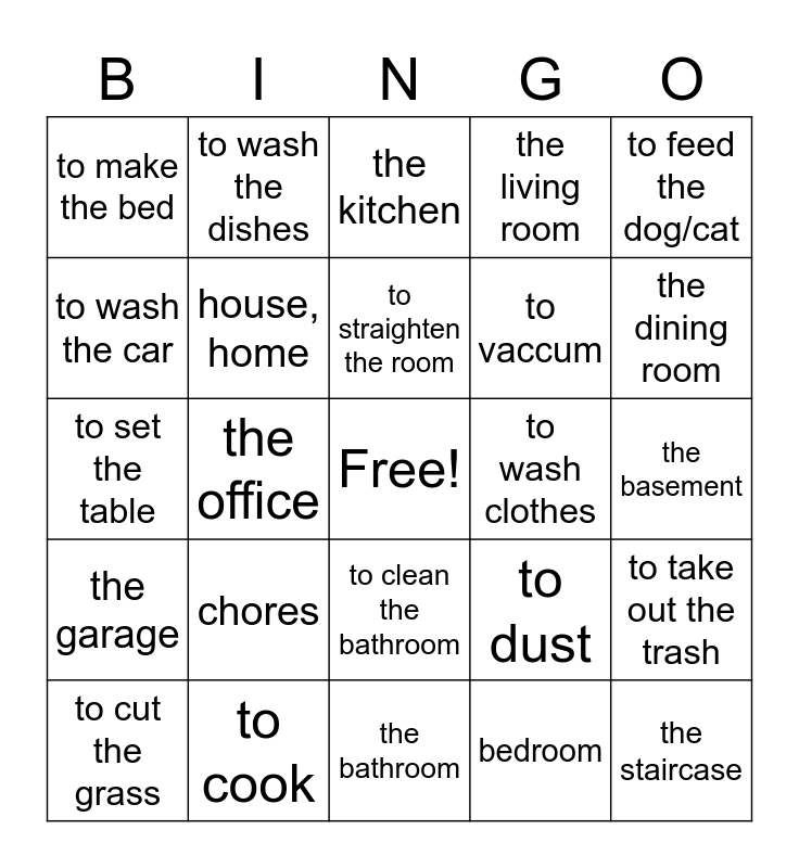 This bingo card has a free space and 24 words: chores, to cook, to straighten the room, to cut the grass, to feed the dog/cat, to make the bed, to wash the car, to wash the dishes, to wash clothes, to clean the bathroom, to vaccum, to set the table, to dust, to take out the trash, house, home, bedroom, the basement, the kitchen, the dining room, the office, the staircase, the garage, the living room and the bathroom.