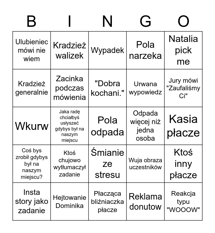 This bingo card has a free space and 24 words: Ktoś chujowo wytłumaczył zadanie, Hejtowanie Dominika, "Dobra kochani.", Insta story jako zadanie, Natalia pick me, Ulubieniec mówi nie wiem, Kradzież generalnie, Kradzież walizek, Odpada więcej niż jedna osoba, Śmianie ze stresu, Urwana wypowiedz, Wkurw, Wuja obraza uczestników, Ktoś inny płacze, Zacinka podczas mówienia, Reklama donutow, Kasia płacze, Wypadek, Jury mówi "Zaufaliśmy Ci", Jaka radę chciałbyś usłyszeć gdybys był na naszym miejscu, Reakcja typu "WOOOW", Coś bys zrobił gdybys był na naszym miejscu?, Pola narzeka and Płacząca bliźniaczka płacze.