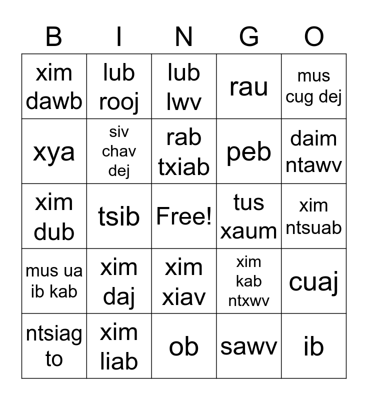 This bingo card has a free space and 34 words: zaum, sawv, tsa tes, ntsia kuv, mus ua ib kab, siv chav dej, mus cug dej, ntsiag to, lub rooj, lub tog, rab txiab, lub lwv, ntaub nplaum, thoob khib nyiab, tus xaum, daim ntawv, xim liab, xim dub, xim daj, xim kab ntxwv, xim xiav, xim paj yeeb, xim dawb, xim ntsuab, ob, ib, rau, yim, peb, xya, plaub, tsib, cuaj and kaum.