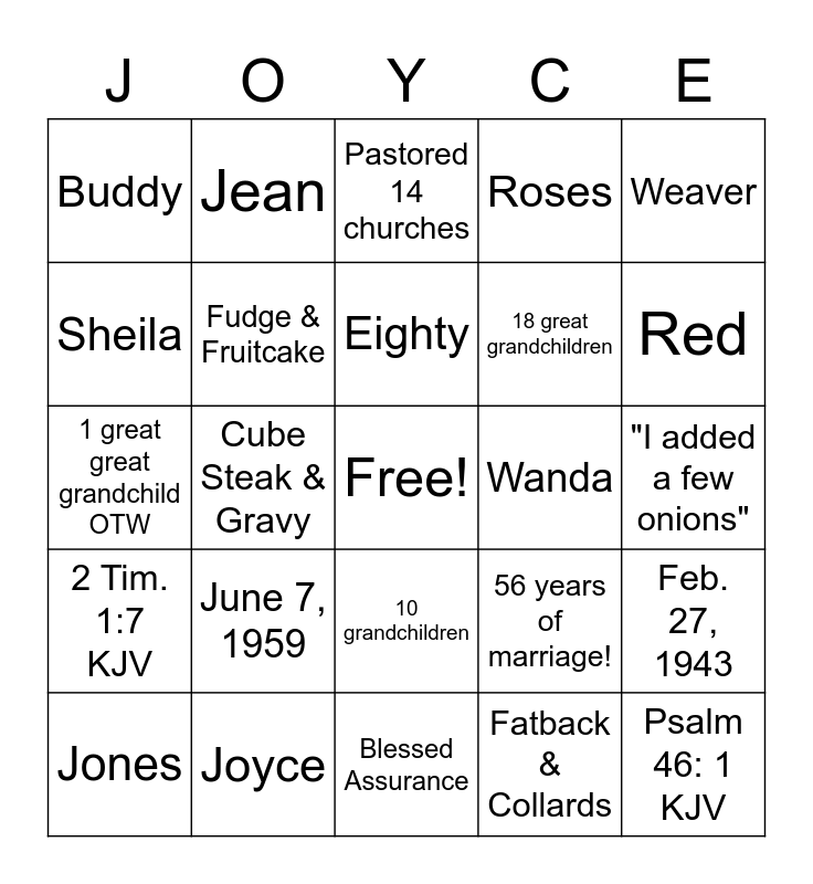 This bingo card has a free space and 24 words: June 7, 1959, Joyce, Eighty, Jones, Weaver, Buddy, Sheila, Jean, Wanda, 10 grandchildren, 18 great grandchildren, 1 great great grandchild OTW, 56 years of marriage!, Feb. 27, 1943, Fudge & Fruitcake, Fatback & Collards, "I added a few onions", Pastored 14 churches, Red, Cube Steak & Gravy, Psalm 46: 1 KJV, 2 Tim. 1:7 KJV, Roses and Blessed Assurance.