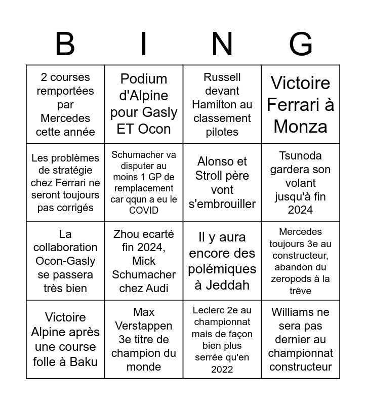 This bingo card has 16 words: Max Verstappen 3e titre de champion du monde, Mercedes toujours 3e au constructeur, abandon du zeropods à la trêve, Russell devant Hamilton au classement pilotes, 2 courses remportées par Mercedes cette année, La collaboration Ocon-Gasly se passera très bien, Podium d'Alpine pour Gasly ET Ocon, Il y aura encore des polémiques à Jeddah, Leclerc 2e au championnat mais de façon bien plus serrée qu'en 2022, Les problèmes de stratégie chez Ferrari ne seront toujours pas corrigés, Schumacher va disputer au moins 1 GP de remplacement car qqun a eu le COVID, Victoire Alpine après une course folle à Baku, Victoire Ferrari à Monza, Zhou ecarté fin 2024, Mick Schumacher chez Audi, Tsunoda gardera son volant jusqu'à fin 2024, Alonso et Stroll père vont s'embrouiller and Williams ne sera pas dernier au championnat constructeur.