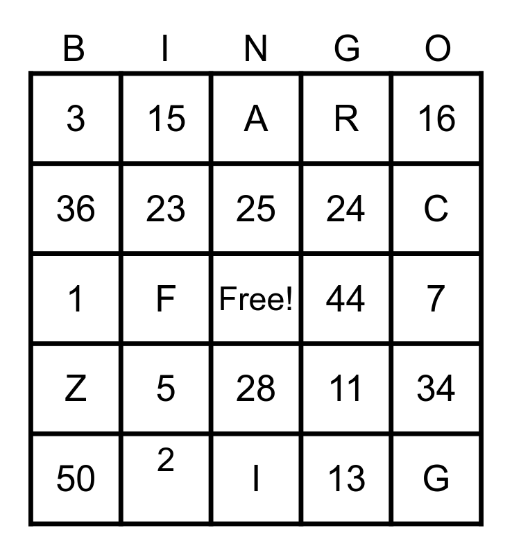 This bingo card has a free space and 24 words: 5, 2, 25, 50, 16, 3, 36, 15, 44, 28, 24, 1, 11, 34, 23, 13, 7, A, C, F, G, Z, R and I.