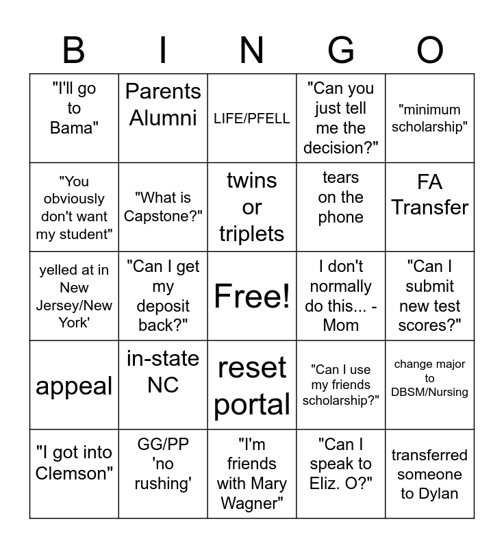 This bingo card has a free space and 24 words: in-state NC, GG/PP 'no rushing', twins or triplets, "I got into Clemson", "minimum scholarship", "I'll go to Bama", "You obviously don't want my student", Parents Alumni, I don't normally do this... - Mom, reset portal, tears on the phone, yelled at in New Jersey/New York', "Can I use my friends scholarship?", change major to DBSM/Nursing, "What is Capstone?", "Can I speak to Eliz. O?", "Can I submit new test scores?", LIFE/PFELL, FA Transfer, "Can I get my deposit back?", transferred someone to Dylan, appeal, "Can you just tell me the decision?" and "I'm friends with Mary Wagner".