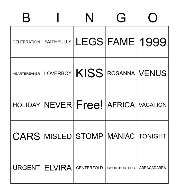 This bingo card has a free space and 54 words: MAGIC, CARS, CRUSIN, BABE, STOMP, HIM, FAME, MISUNDERSTANDING, HEARTBREAKER, REFUGEE, CELEBRATION, RAPTURE, ELVIRA, URGENT, PHYSICAL, CENTERFOLD, ABRACADABRA, ROSANNA, GLORIA, VACATION, MANIAC, JEOPARDY, AFRICA, 1999, ALLENTOWN, FAITHFULLY, PHOTOGRAPH, FOOTLOOSE, JUMP, GHOSTBUSTERS, BORDERLINE, DRIVE, INFATUATION, AUTOMATIC, LEGS, THRILLER, HOLIDAY, TONIGHT, SHOUT, LOVERBOY, LOVERGIRL, SUSSUDIO, STRUT, OBSESSION, MISLED, FREEDOM, SOLID, FRESH, KISS, NEVER, VENUS, CONGA, NASTY and RUMORS.