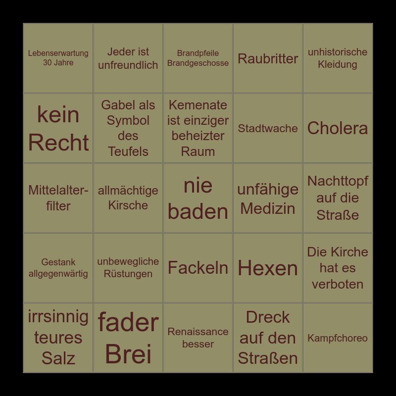 This bingo card has 26 words: Fackeln, Dreck auf den StraΓen, Kemenate ist einziger beheizter Raum, fader Brei, unhistorische Kleidung, Lebenserwartung 30 Jahre, kein Recht, Jeder ist unfreundlich, Nachttopf auf die StraΓe, Hexen, Stadtwache, Mittelalter-filter, Die Kirche hat es verboten, irrsinnig teures Salz, allmΓ€chtige Kirsche, Bier weil Wasser dreckig, Raubritter, Gestank allgegenwΓ€rtig, Brandpfeile Brandgeschosse, nie baden, Cholera, Renaissance besser, unfΓ€hige Medizin, unbewegliche RΓΌstungen, Gabel als Symbol des Teufels and Kampfchoreo.