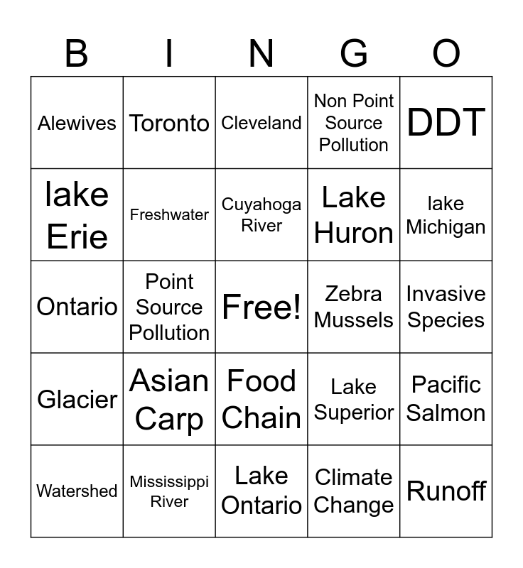 This bingo card has a free space and 39 words: Rural, Urban, Ecosystem, Freshwater, Watershed, Food Chain, Cuyahoga River, Algae, DDT, Glacier, Point Source Pollution, Non Point Source Pollution, Runoff, Invasive Species, Zebra Mussels, Asian Carp, Sea Lampreys, Alewives, Wetlands, Lake Superior, lake Erie, Lake Ontario, Lake Huron, lake Michigan, Habitat Loss, Population Growth, Factories, Chicago, Niagara Falls, Toronto, HOMES, St. Lawrence River, Cleveland, Mississippi River, Climate Change, Timber, Pacific Salmon, Ontario and Flooding.