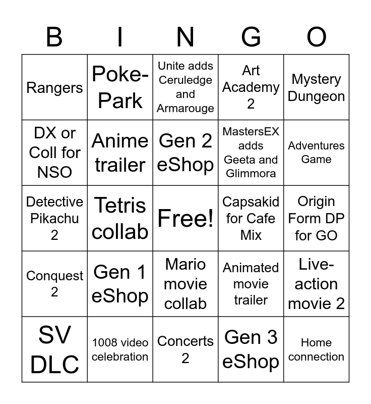 This bingo card has a free space and 24 words: SV DLC, Gen 1 eShop, Gen 2 eShop, Gen 3 eShop, Mystery Dungeon, Rangers, Poke-Park, Unite adds Ceruledge and Armarouge, Capsakid for Cafe Mix, Origin Form DP for GO, Detective Pikachu 2, Anime trailer, Animated movie trailer, Live-action movie 2, DX or Coll for NSO, 1008 video celebration, Concerts 2, Art Academy 2, Adventures Game, Conquest 2, Tetris collab, Mario movie collab, MastersEX adds Geeta and Glimmora and Home connection.