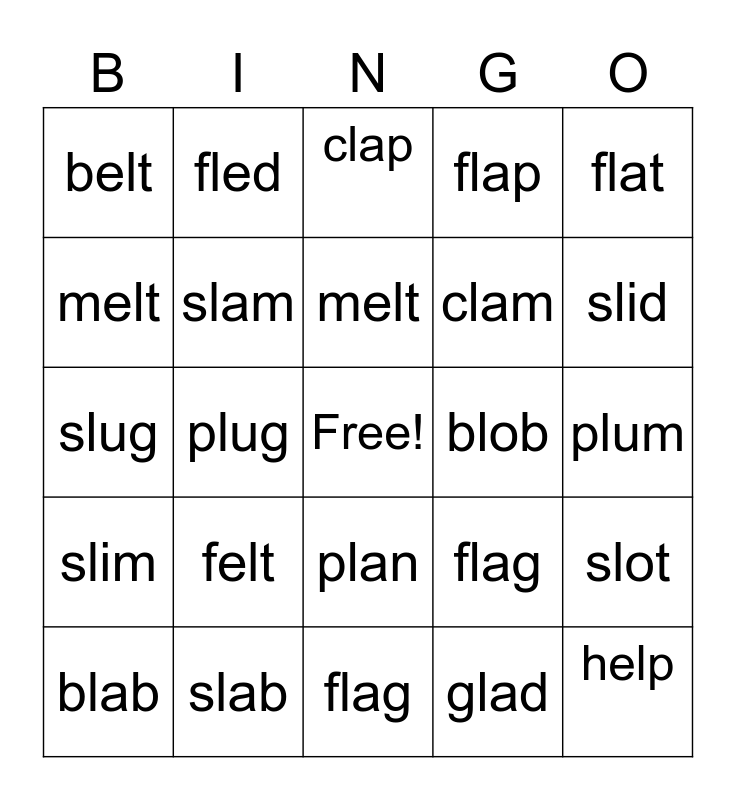 This bingo card has a free space and 29 words: blab, plot, plug, clip, belt, clap, slam, felt, blob, slab, plum, help, flag, glad, slid, sled, plan, slim, flat, slug, flag, clot, clam, melt, flap, fled, slot, melt and fled.