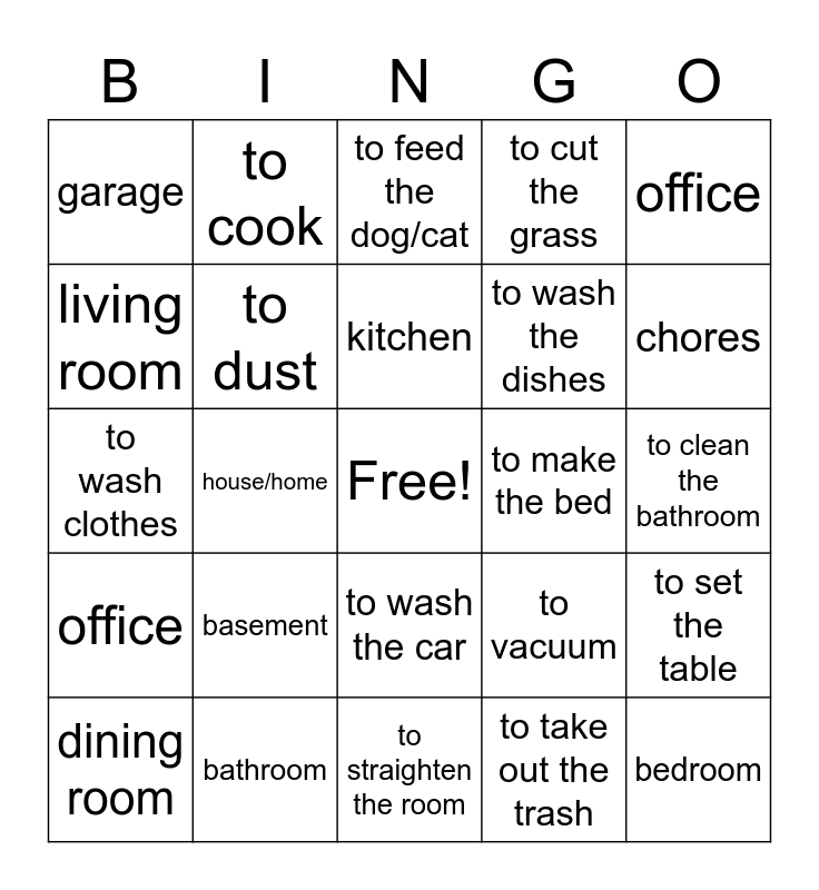 This bingo card has a free space and 24 words: basement, bathroom, kitchen, dining room, office, garage, living room, to cook, to make the bed, to wash the car, to wash the dishes, to wash clothes, to vacuum, to set the table, to dust, to take out the trash, to clean the bathroom, to feed the dog/cat, chores, house/home, bedroom, office, to cut the grass and to straighten the room.