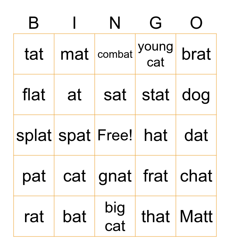 This bingo card has a free space and 24 words: cat, bat, sat, rat, brat, tat, flat, mat, hat, gnat, stat, splat, frat, chat, at, that, dat, combat, dog, spat, Matt, pat, young cat and big cat.