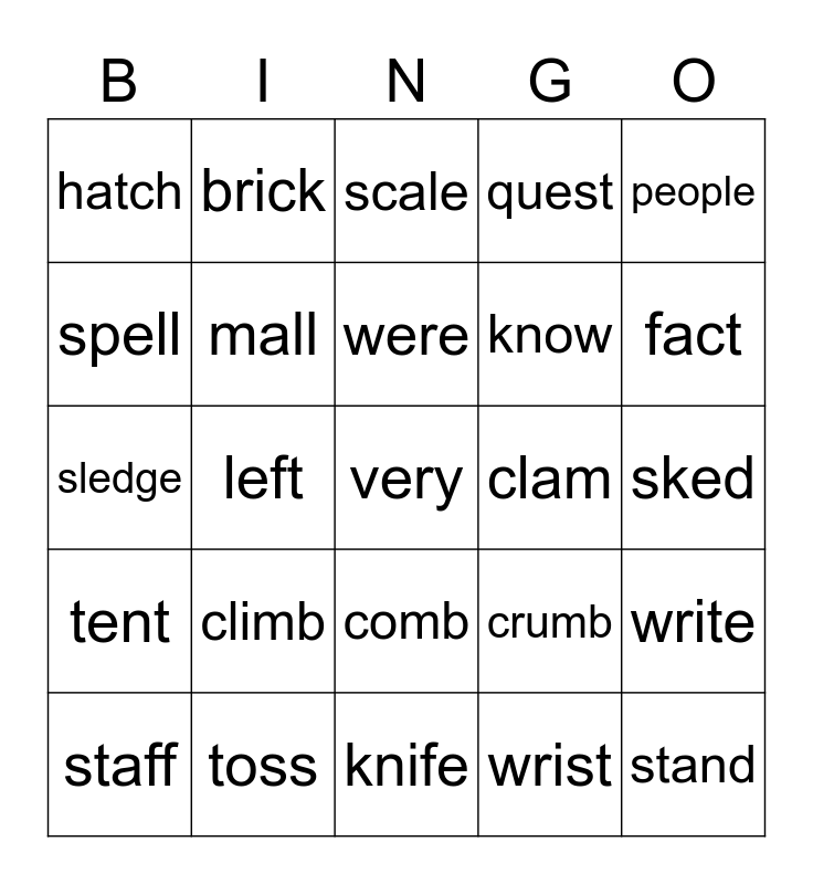 This bingo card has a free space and 24 words: climb, toss, were, staff, people, hatch, spell, brick, clam, comb, know, sledge, crumb, write, mall, wrist, sked, scale, fact, left, stand, tent, quest and knife.