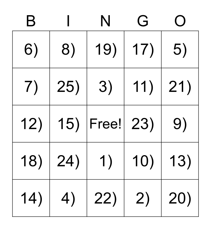 This bingo card has a free space and 26 words: 1), 2), 3), 4), 5), 6), 7), 8), 9), 10), 11), 12), 13), 14), 15), 16), 17), 18), 19), 20), 21), 22), 23), 24), 25) and 26).